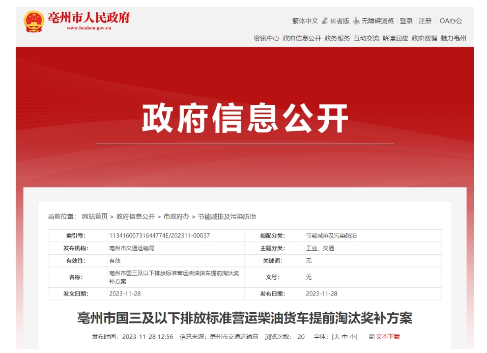 安徽省亳州市國三及以下排放標(biāo)準(zhǔn)營運(yùn)柴油貨車提前淘汰獎(jiǎng)補(bǔ)方案