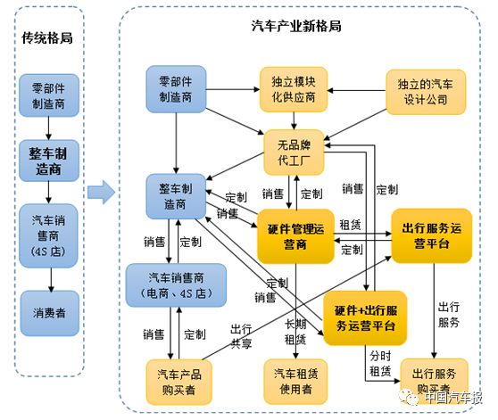 隨著汽車消費(fèi)側(cè)出現(xiàn)消費(fèi)者從買車到租車,從購買汽車產(chǎn)品轉(zhuǎn)向購買出行服務(wù),傳統(tǒng)整車企業(yè)通過產(chǎn)品品牌對消費(fèi)者的影響力減弱;隨著汽車電動(dòng)化、數(shù)字化、網(wǎng)絡(luò)化和平臺化的發(fā)展趨向,傳統(tǒng)整車企業(yè)通過垂直分工體系對供應(yīng)鏈的控制力逐步減弱;隨著具有典型互聯(lián)網(wǎng)模式、對消費(fèi)者偏好和需求有充分了解的平臺公司崛起,以傳統(tǒng)整車企業(yè)為中心的產(chǎn)業(yè)流程正在改變,產(chǎn)業(yè)重心正在從汽車制造向出行服務(wù)轉(zhuǎn)移。汽車產(chǎn)業(yè)經(jīng)歷了上百年的發(fā)展,以傳統(tǒng)整車企業(yè)為中心、大規(guī)模生產(chǎn)和大規(guī)模銷售模式為主導(dǎo)的傳統(tǒng)汽車產(chǎn)業(yè)格局正在走向以滿足個(gè)性化消費(fèi)和出行服務(wù)為中心的新產(chǎn)業(yè)格局。下圖為汽車傳統(tǒng)產(chǎn)業(yè)格局和新產(chǎn)業(yè)格局的對比。
